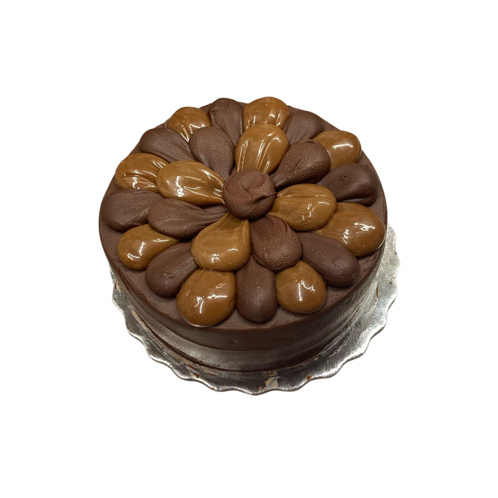 Chocolate cake layered with caramel covered in chocolate ganache & caramel