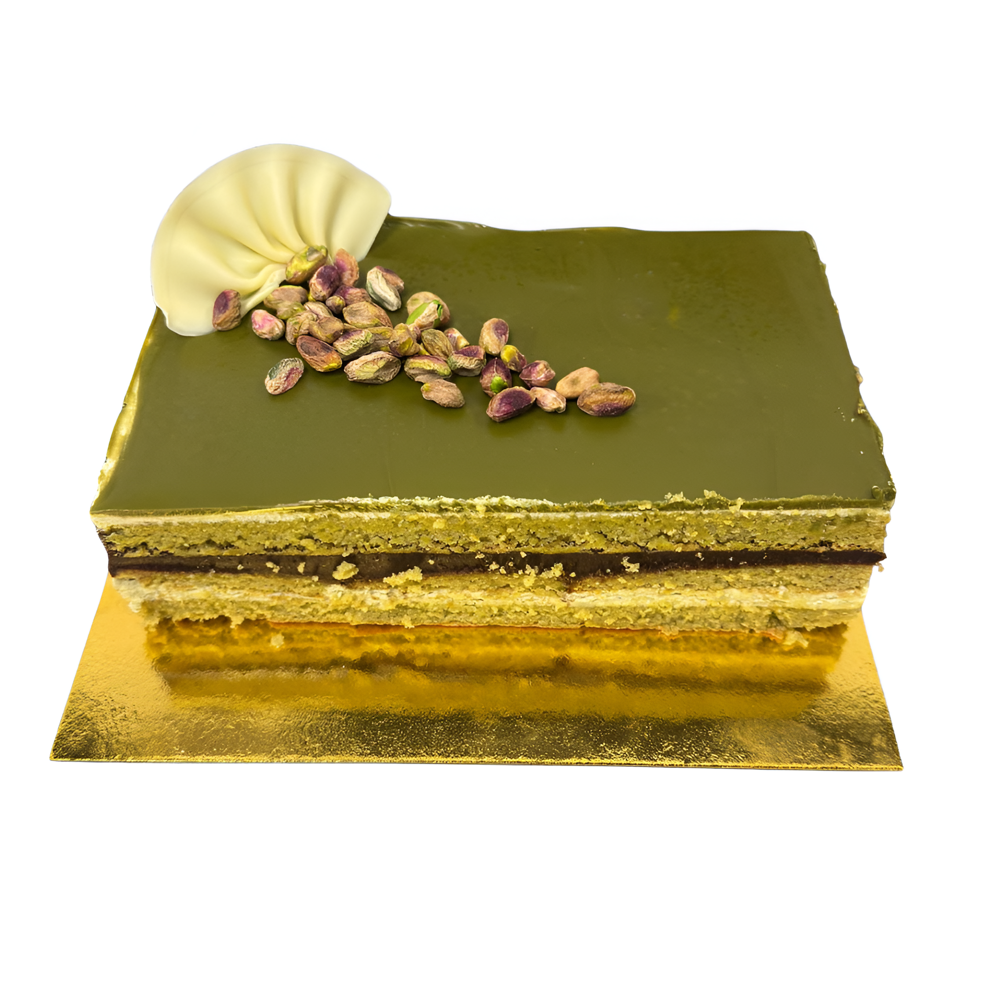 Almond sponge, pistachio buttercream, chocolate ganache, pistachio glaze